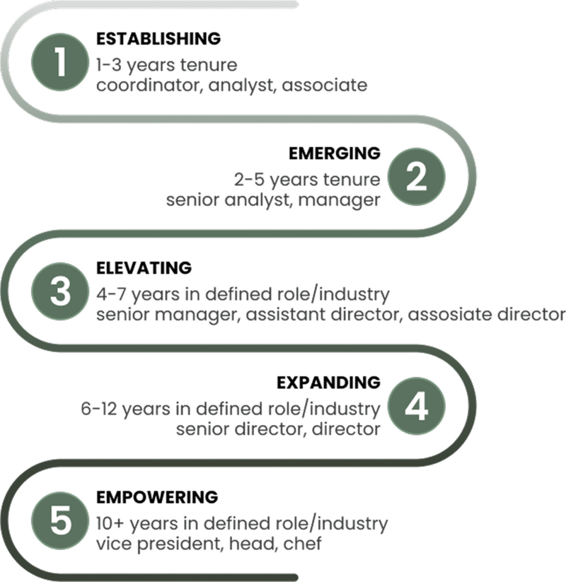 This framework identifies five key career stages - Establishing, Emerging, Elevating, Expanding, and Empowering - each with distinct characteristics and growth opportunities.